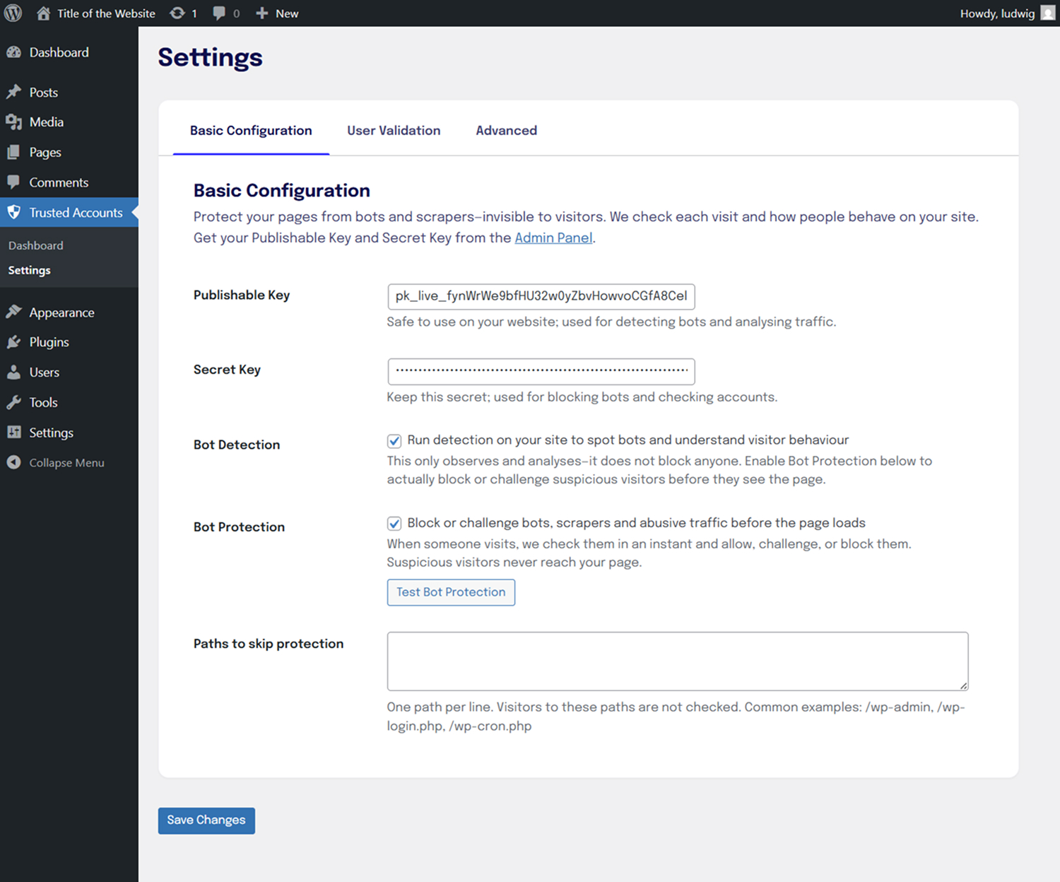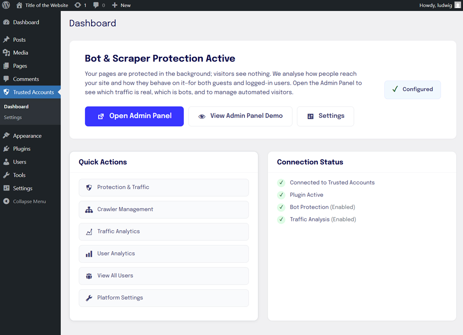 Trusted Accounts protects your WordPress pages in the background. Each request is checked (allow / challenge / block, typically under 50 ms) — we stop bots before they even reach your site, so you get effective bot, scraper & spam protection without CAPTCHAs. On the page, our SDK sends behaviour data for additional real-time security. Works for anonymous traffic and for logged-in users.
